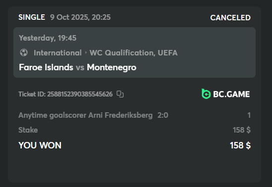 10. Ticket ID: 2588152390385545626 So I was watching this game and thought to place a bet on Arni Frederiksberg to score as it looked clear that more goals were going to be scored in the game. As you can see, i placed the bet when it was 2-0 and he scored the 4th goal. I open bc game to collect my winnings and to my surprise the bet for some reason has been cancelled and voided. I have now been on livechat for 5 days trying to get this resolved, yet they are saying the same issue they are 'looking at it' 'working urgently', yet they then said today i had to create a new ticket as it got messed up. They clearly are trying to get out of paying me and I am doing this to spread awareness, or maybe the team can rectify this mistake and settle the bet correctly. The livechat agent assured me to check in after 24 hours and it would be sorted yet nothing. Please help me out as this money is very much needed, especially after the crypto crash on Friday.