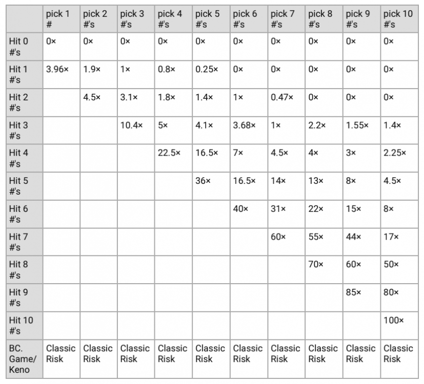 8. In case anyone finds these helpful. Low Risk Payouts; Classic Risk Payouts; Medium Risk Payouts; High Risk Payouts; If you spot any mistakes please let me know and ill fix it really quick. I've double checked multiple times and i dont see any myself. Should be good to go. Gonna post them in Keno section as well.