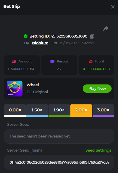 $2k Prestige Wheel Challenge #29 Hey Ladies and Gentlemen! This week's challenge game is Wheel! With a prize pool of $2,000, the Top 10 will take home a major prize, and the remaining $700 will be split between all other participants! Turn the wheel and may the luck be with you! – Check out more details below. What's the Challenge? Participants must win as many consecutive bets as possible by hitting the color Green or Orange (On in-house Wheel game). Consecutive bets must be of the same color to validate the entry. Any selected Risk and Segment are valid. Rank will be determined by the largest amount of consecutive bets, the longest sequence will be in 1st place and successively. In the event of a tie, the advantage will be given to the highest average bet in dollars. In the event of a tie again, the first bet placed will have the advantage. Minimum VIP Tier Must be VIP04 or higher in order to enter this challenge. Minimum Bets Win at least 3 consecutive bets to qualify, hitting one of the 2 colors mentioned above (Consecutive wins must be the same color). Minimum Bet Size $0.30 USD equivalent Eligible Coins All cryptocurrencies are eligible (excepting JB) Available Prizes 1st Place....... $500 2nd Place..... $300 3rd Place...... $200 4th Place......$100 5th Place......$50 6th-10th.........$30 The remaining $700 will be split between all other participants who meet minimum requirements, min payouts, and minimum bet. How to Enter To enter, copy the link of the bet you'd like to submit. Once you've copied it, paste it as a reply to this thread like so: Link: https://bc.game/sd/?sd=10K6AIL81XOLCJ In the same post, upload a screenshot of your win by clicking the game ID WITH VIEW IN USD mode ENABLED (accessible at the bottom of dropdown menu for your wallet up top. This way, we can ensure that your bet indeed met the minimum requirement at the time of placing it: Link: https://bc.game/sd/?sd=10K6AIL81XOLCJ Please combine all of your hits together in a SINGLE post. Edit your existing post for additional hits, don't create a new post. Bets must be posted within 24 hours of placing bet in order to keep things fair for everyone. Bets must be made during the specified time window stated above. This thread will lock automatically when the time period is over. One (1) entry per household. Anyone found attempting to win multiple prizes will be disqualified from this challenge as well as all future challenges. Failure to follow instructions will result in your submission being null and void. By entering this challenge, you acknowledge that BC.Game has the final decision on results and placement. Payouts will be made within 72 hours of challenge completion, please be patient, we promise you that we haven't forgotten. We check and double check to make sure the rightful winners receive their prize. Prizes will be paid out in BCD. Good Luck everyone!