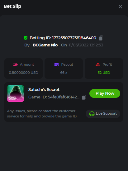 $2.5k Prestige Hash Dice Challenge #32 Welcome players, it's time to take chances! The challenge is the Hash Dice and participants will need to reach 16 exact target payouts, and all of them together will be summed up as 1 point (maximum 16 points). The Prize pool is $2,500 of which $500 will be reserved for the extra bonus. Get ready! Life is a gamble and you never know what comes next, so roll the dice! What's the Challenge? Complete as many of the following 16 payouts on Hash Dice. Must be a exact muliplier. | 20 | 30 | 33 | 50 | 66 | 71 | 99 | 200 | 250 | 444 | 500 | 555 | 900 | 1200 | 2500 | 3000 | Each payout you hit above counts as 1 point (Maximum 1 point for each payout). If there is a tie, the player with the higher average bet amount (in USD) shall be the winner. Minimum VIP There's no minimum VIP level Eligibility to Win Prize Win at least 2 payouts to qualify. Minimum Bet Size $0.20 USD equivalent Eligible Coins All cryptocurrencies are eligible (excepting JB) Available Prizes 1st Place....... $500 2nd Place..... $300 3rd Place...... $200 4th Place......$100 5th Place......$50 6th-10th.........$30 All other participants.........$700 Bounty Prize...$500, equal share. EXTRA BOUNTY Post a winning bet with 777x multiplier or more and receive an equal share of the $500 prize pool! Original rules apply with all minimum requirements. How to Enter To enter, copy the link of the bet you'd like to submit. Once you've copied it, paste it as a reply to this thread like so: Link: https://bc.game/sd/?sd=10LM00ZSRP3IMR In the same post, upload a screenshot of your win by clicking the game ID WITH VIEW IN USD mode ENABLED (accessible at the bottom of dropdown menu for your wallet up top. This way, we can ensure that your bet indeed met the minimum requirement at the time of placing it: Link: https://bc.game/sd/?sd=10LM00ZSRP3IMR Please combine all of your hits together in a SINGLE post. Edit your existing post for additional hits, don't create a new post. Each eligible entry must have the Bet Slip URL, failure to include it will disqualify participation in the event. Bet Slip image is not mandatory. Bets must be posted within 24 hours of placing bet in order to keep things fair for everyone. Bets must be made during the specified time window stated above. This thread will lock automatically when the time period is over. One (1) entry per household. Anyone found attempting to win multiple prizes will be disqualified from this challenge as well as all future challenges. Failure to follow instructions will result in your submission being null and void. By entering this challenge, you acknowledge that BC.Game has the final decision on results and placement. Payouts will be made within 72 hours of challenge completion, please be patient, we promise you that we haven't forgotten. We check and double check to make sure the rightful winners receive their prize. Prizes will be paid out in BCD. Good luck everyone!