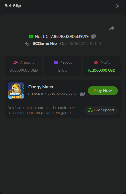 $2.5k Prestige Doggy Miner Challenge #35 Who let the dog out? Who? Who, who, who? Today someone let the Doggy Miner out and its prize pool is $2,500 while the Top 10 will take home a major prize, $700 will be split between all other participants, including a share of the $500 prize pool for anyone who completes our extra bounty. The goal is for the players to achieve the highest possible payout. No matter what the odds are, stay paw-sitive and woof! (means bet in dog). What's the Challenge? Win the highest multiplier you can on Doggy Miner slot. By Croco Gaming. If there is a tie, the player with the higher average bet amount (in USD) shall be the winner. If there is a tie in the amount and payout, the one who posted or edited his post first will be considered in the Ranking. Minimum VIP There's no minimum VIP level Minimum Payouts Minimum payout to qualify is 20x Minimum Bet Size $0.50 USD equivalent Eligible Coins All cryptocurrencies are eligible (excepting JB) Available Prizes 1st Place....... $500 2nd Place..... $300 3rd Place...... $200 4th Place......$100 5th Place......$50 6th-10th.........$30 All other participants.........$700 Bounty Prize...$500, equal share. EXTRA BOUNTY Post a winning bet with 100x multiplier or above and receive an equal share of the $500 prize pool! Original rules apply with all minimum requirements. How to Enter To enter, copy the link of the bet you'd like to submit. Once you've copied it, paste it as a reply to this thread like so: Link: https://bc.game/sd/?sd=10N2EPI9KUKKCZ In the same post, upload a screenshot of your win by clicking the game ID WITH VIEW IN USD mode ENABLED (accessible at the bottom of dropdown menu for your wallet up top. This way, we can ensure that your bet indeed met the minimum requirement at the time of placing it: Link: https://bc.game/sd/?sd=10N2EPI9KUKKCZ Please combine all of your hits together in a SINGLE post. Edit your existing post for additional hits, don't create a new post. Each eligible entry must have the Bet Slip URL, failure to include it will disqualify participation in the event. Bet Slip image is not mandatory. Bets must be posted within 24 hours of placing bet in order to keep things fair for everyone. Bets must be made during the specified time window stated above. This thread will lock automatically when the time period is over. One (1) entry per household. Anyone found attempting to win multiple prizes will be disqualified from this challenge as well as all future challenges. Failure to follow instructions will result in your submission being null and void. By entering this challenge, you acknowledge that BC.Game has the final decision on results and placement. Payouts will be made within 72 hours of challenge completion, please be patient, we promise you that we haven't forgotten. We check and double check to make sure the rightful winners receive their prize. Prizes will be paid out in BCD. Good luck everyone!