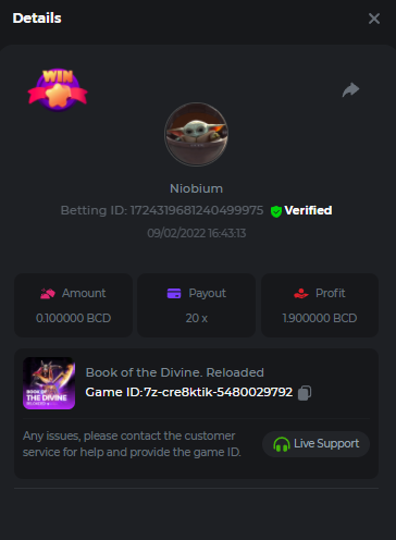 $1K Prestige in-house Slots Challenge #13 Hey there, BC players! We are back in the third week of the month to challenge you all in three exclusive slot games, with a prize pool of $1,000. Don't limit your multipliers, we look forward to seeing the highest combined payouts in our in-house slots (more details below). What's the Challenge? Win a bet on our in-house slots selected below with the highest possible multiplier. Maximum of 1 entry per in-house game. [Saviour Sword | Egyptian Adventure | Oriental Beauties]. All multipliers reached in each in-house slot will be added together, bonus rounds (free spins) are valid. The Top 10 BC players who reach the highest total payouts will split a share of the prize pool. If there is a tie, the participant with the higher average bet amount (in USD) shall be the winner. If there is a tie in the payout and amount, the one who posted or edited his post first will be considered in the Ranking. Minimum VIP There's no minimum VIP level Minimum Payout Minimum payout to qualify is 10x Minimum Bet Size $0.05 USD equivalent Eligible Coins All coins are eligible (excepting JB) Available Prizes 1st Place........$400 2nd Place......$200 3rd Place........$100 4th Place.........$50 5th-10th............$45 How to Enter To enter, copy the bet ID of the bet you'd like to submit. Once you've copied it, post it as a reply to this thread like so: Betting ID: 40578550364897347 In the same post, upload a screenshot of your win by clicking the game ID WITH VIEW IN USD mode ENABLED (accessible at the bottom of dropdown menu for your wallet up top. This way, we can ensure that your bet indeed met the minimum requirement at the time of placing it: Betting ID: 40578550364897347 Please combine all of your hits together in a SINGLE post. Edit your existing post for additional hits, don't create a new post. Bets must be posted within 24 hours of placing bet in order to keep things fair for everyone. Bets must be made during the specified time window stated above. This thread will lock automatically when the time period is over. One (1) entry per household. Anyone found attempting to win multiple prizes will be disqualified from this challenge as well as all future challenges. Failure to follow instructions will result in your submission being null and void. By entering this challenge, you acknowledge that BC.Game has the final decision on results and placement. Payouts will be made within 72 hours of challenge completion, please be patient, we promise you that we haven't forgotten. We check and double check to make sure the rightful winners receive their prize. Prizes will be paid out in BCD. Best of luck playing!