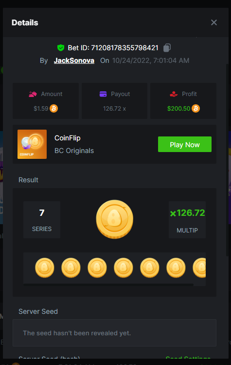 4. Bounty qualified first post/edit: Bet ID: 71208178355798142 https://bc.game/#/sd/10VLM0T0UNY2AB I noticed for the bounty entry (1st one) the amount says $0.14 even though I bet $0.15 USD equivalent as required, but just to be sure so that it qualifies for bounty and meets requirements, here's a screenshot of the game just ending showing it was $0.15 for the bet amount Bet ID 71208178355798421 https://bc.game/#/sd/10VQ7FGVYWP24Z Bet ID: 71208178355798601 https://bc.game/#/sd/10VQ8G1CQMPUS3
