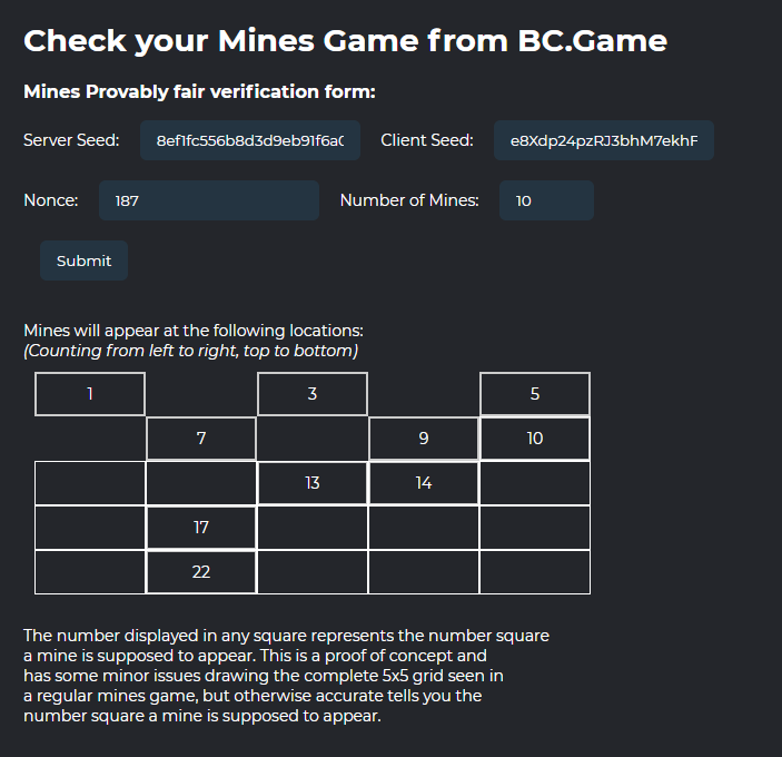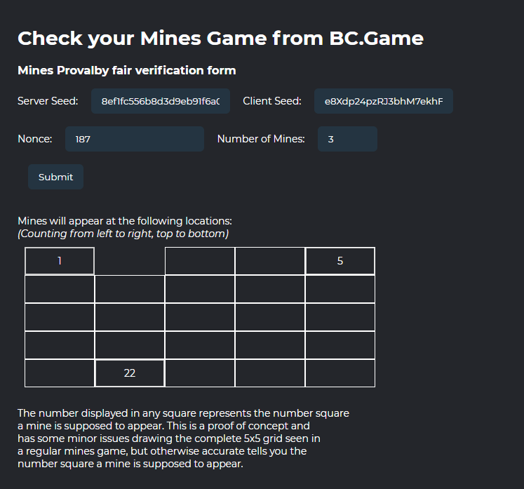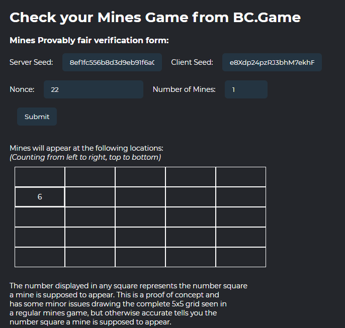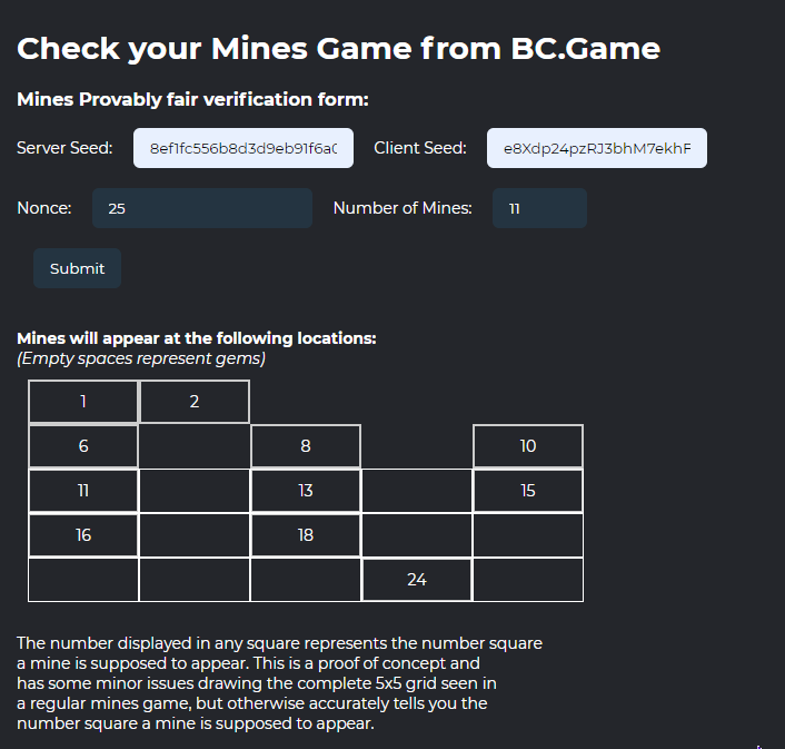 3. I may not be a smart coder, but I learned some coding just for this! Please see my submission for my Mines Provably Fair Checker: https://codepen.io/nucleare/pen/ZEjWVmr The most challenging part as a non-coder to learn and realize was that the original JavaScript given by the provably fair page for mines is meant to function in a Node.js environment and to be used with a browser, I had to adapt the script to use crypto.js There's still some visual improvements to be applied but I believe the harder part of the coding has been done and has been made to account for setting the number of mines as shown: Changing the number of mines and submitting the form again will update the table as appropriate, displaying the number result in the appropriate equivalent location: The final steps will be replacing empty squares with gems, and the numbers with graphics of the mines and of course, as a result of that, fix the appearance of the grid not breaking up like it does, depending on the number of mines being selected. But, for the record, on certain 'Number of Mines' settings, it will display correctly: After submitting these screenshots, I fixed some of the grammatical errors and improved the wording to be more clear: Thank you for your consideration!