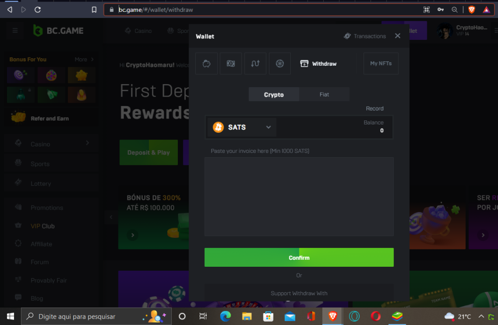 1. Website URL ( https://bc.game/pt/#/wallet/deposit/CHAIN) Device & System ( PC Windows 10 - 64 bits) Feedback / Live bug / User experience. ( The bitcoin satoshis deposit (SATS) screen does not appear completely. ) Journey ( In Chrome, Brave and Opera browsers the screen does not show all data for depositing bitcoin satoshis (SATS). ) Website URL ( https://bc.game/#/wallet/withdraw) Device & System ( PC Windows 10 - 64 bits) Feedback / Live bug / User experience. (The bitcoin satoshis withdraw (SATS) screen does not appear completely.) Journey ( In Chrome, Brave and Opera browsers the screen does not show all the data for withdrawing bitcoin satoshis (SATS). )