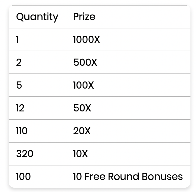 DROPS & WINS Duration: 8th February 2023 19:01 - 3rd May 2023 18:59 Prize Pool: $1,000,000/per month Drops & Wins Daly Prize Drops and Weekly Tournaments, a player’s favorite will continue to boost the gaming experience in some of the most popular video slot games on the market. Between 8th February and 3rd May 2023, we are committed to giving out $1,000,000 monthly in the form of cash, multiplier, and Free Round Bonuses as prizes. Check below the terms and conditions of this tournament and prize distributions. Drops & Wins (Slots) Participating games Wolf Gold™, Mustang Gold™, Sweet Bonanza™, John Hunter and the Tomb of the Scarab Queen™, Great Rhino Megaways™, John Hunter and the Book of Tut™, The Dog House™, The Dog House Megaways™, Chilli Heat™, Fruit Party™, Big Bass Bonanza™, Madame Destiny Megaways™, Gems Bonanza™, Wild Wild Riches™, Wild West Gold™, Gates of Olympus™, Power of Thor Megaways™, Floating Dragon Hold&Spin™, The Hand of Midas™, Buffalo King Megaways™, Juicy Fruits™, Bigger Bass Bonanza™, Starlight Princess™, Joker’s Jewels™, Big Bass Bonanza Megaways™, Book of The Fallen™, 5 Lions Megaways™, Buffalo King™, Cleocatra, Extra Juicy Megaways™, Wild West Gold Megaways, Big Bass Splash, Sugar Rush, Book of Golden Sands, Floating Dragon Megaways, Big Bass – Keeping it Reel™, Release the Kraken 2™, Fury of Odin Megaways™, Hot Pepper™, PIZZA! PIZZA? PIZZA!™, Sweet Powernudge™, Pinup Girls, Secret City Gold, Mammoth Gold Megaways, Fish Eye, Monster Superlanche, Fire Archer Eligible Games from 8th FEB 2023 19:01 CET to 3rd May 2023 18:59 CEST, from time to time the provider will update the list and we will update this forum with new list. Drops & Wins (Live Casino) Participating games Daily Prize Drops: Auto-Roulette 1 (ID – 225), Roulette 1 – Azure (ID – 227), Roulette 2 (ID – 201), Roulette 3 – Macao (ID – 206), Roulette 4 – Russian (ID – 221), Roulette 5 – German (ID – 222), Roulette 6 – Turkish (ID – 224), Roulette 7 – Italian (ID – 223), Roulette 8 – Indian (ID – 229), Roulette 9 – The Club (ID – 545), Roulette 11 – Dutch (ID – 235), Roulette 12 – Romanian (ID – 233), Roulette 14 – Spanish (ID – 234), Speed Roulette 1 (ID – 203), Speed Roulette 2 (ID – 205), Roulette 10 – Ruby (ID – 230), Mega Roulette (ID – 204), Sweet Bonanza Candyland (ID – 1101), Mega Wheel (ID – 801), Boom City (ID – 1401), Power UP Roulette (ID – 240), Roulette 15 – Flemish (ID – 241) plus dedicated tables Weekly Blackjack Tournament: Blackjack 10 – Azure (ID – 517), Blackjack 22 – Azure (ID – 526), Blackjack 23 – Azure (ID – 527), Blackjack 24 – Azure (ID – 528), Blackjack 25 – Azure (ID – 529), Blackjack 26 – Azure (ID – 530), Blackjack 30 – Azure (ID – 536), Blackjack 31 – Azure (ID – 535), Blackjack 32 – Azure (ID – 540), Blackjack 33 – The Club (ID – 541), Blackjack 34 – The Club (ID – 542), Blackjack 35 – The Club (ID – 543), Blackjack 36 – The Club (ID – 544), Blackjack 6 – Azure (ID – 512), Blackjack 7 – Azure (ID – 513), Blackjack 8 – Azure (ID – 520), Blackjack 9 – Azure (ID – 516), ONE Blackjack (ID – 901), ONE Blackjack 2 – Ruby (ID – 902), ONE Blackjack 3 – Dutch (ID – 903), Blackjack 48 – Ruby (ID – 551), Blackjack 49 – Ruby (ID – 552), Blackjack 50 – Ruby (ID – 553), Blackjack 51 – Ruby (ID – 554), VIP Blackjack 1 – Ruby (ID – 546), VIP Blackjack 2 – Ruby (ID – 547), VIP Blackjack 3 – Ruby (ID – 548), VIP Blackjack 4 – Ruby (ID – 549), VIP Blackjack 5 – Ruby (ID – 550), Speed Blackjack 3 – RUBY (ID – 568), Speed Blackjack 4 – RUBY (ID – 569), Speed Blackjack 5 – RUBY (ID – 570), Speed Blackjack 1 – Ruby (ID – 566), Speed Blackjack – 2 Ruby (ID – 567), Blackjack 3 Azure (ID – 511), Blackjack 4 Azure (ID – 514), Blackjack 1 Azure (ID – 515), Blackjack 5 Azure (ID – 518), Blackjack 2 Azure (ID – 519), Blackjack 11 (ID – 301), Blackjack 12 (ID – 302), Blackjack 14 (ID 303), Blackjack 15 (ID – 304), Blackjack 16 (ID – 305), Blackjack 17 – Azure (ID – 521), Blackjack 18 – Azure (ID – 522), Blackjack 19 – Azure (ID – 523), Blackjack 20 – Azure (ID – 524), Blackjack 21 – Azure (ID – 525), Blackjack 27 – Azure (ID – 539), Blackjack 28 – Azure (ID – 538), Blackjack 29 – Azure (ID – 537), Blackjack 37 – Ruby (ID – 562), Blackjack 38 – Ruby (ID – 563), Blackjack 39 – Ruby (ID – 564), Blackjack 40 – Ruby (ID – 565), Blackjack 41 – Ruby (ID – 555), Blackjack 42 – Ruby (ID – 55)6), Blackjack 43 – Ruby (ID – 557), Blackjack 44 – Ruby (ID – 558), Blackjack 45 – Ruby (ID – 559), Blackjack 46 – Ruby (ID – 560), Blackjack 47 – Ruby (ID – 561), Blackjack 52 – Ruby (ID – 594), Blackjack 53 – Ruby (ID – 595), Blackjack 54 – Ruby (ID – 596), Blackjack 55 – Ruby (ID – 597), Blackjack 56 – Ruby (ID – 593), Blackjack 57 – Azure ( ID – 598), Blackjack 58 – Azure (ID – 599), Blackjack 59 – Azure (ID – 600), Blackjack 60 – Azure (ID – 601), Blackjack 61 – Azure (ID – 602), Blackjack 62 – Azure (ID – 603), Blackjack 63 – Azure (ID – 590), Speed Blackjack 6 – Ruby (ID – 591), Speed Blackjack 7 – Ruby (ID – 592), Speed Blackjack 8 – Ruby (ID – 604), Speed Blackjack 9 – Ruby (ID – 605), Speed Blackjack 10 – Ruby (ID – 606), Speed Blackjack 11 – Azure (ID – 607), Speed Blackjack 12 – Azure (ID – 608), Speed Blackjack 14 – Azure (ID – 609), ONE Blackjack 4 – Flemish (ID – 905) From time to time the games may be changed. It will be available every Friday, Saturday, and from Feb 8th, 2023, at 19:01 CET, until May 3, 2023, at 18:59 CET. General Rules: Weekly Tournaments (Regular Weeks): The leaderboard is ranked in accordance with the score, which score is based on the highes