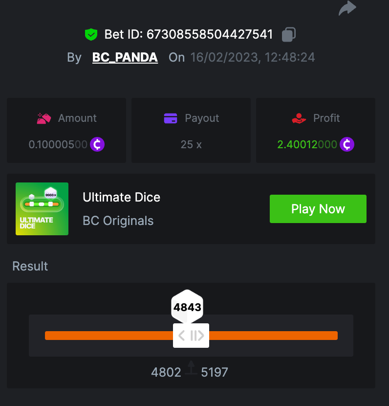 $1.5k Prestige Ultimate Dice Challenge #70 DURATION: 16th FEB - 20th FEB 09:00 am UTC What's the Challenge? Complete as many of the following 18 multipliers on our in-house Ultimate Dice. Must be a winning bet. | 15x | 25x | 33x | 44x | 55x | 75x | 99x | 150x | 220x | 300x | 396x | 550x | 825x | 900x | 1100x | 2475x | 3300x | 4950x | Each multiplier you hit above counts as 1 point (Maximum 1 point for each multiplier). If there is a tie, the player with the higher average bet amount (in USD) shall be the winner. How to Enter To enter, copy the link of the bet you'd like to submit. Once you've copied it, paste it as a reply to this thread like so: Link: https://bc.game/#/sd/113MGSO9RYH98Z In the same post, upload a screenshot of your win by clicking the game ID WITH VIEW IN USD mode ENABLED (accessible at the bottom of dropdown menu for your wallet up top. This way, we can ensure that your bet indeed met the minimum requirement at the time of placing it: Link: https://bc.game/#/sd/113MGSO9RYH98Z Minimum VIP There's no minimum VIP level Minimum Payouts Hit at least 3 payouts to qualify Minimum Bet Size $0.10 USD equivalent Eligible Coins All cryptocurrencies are eligible (excepting JB, and BCL) Available Prizes Positions 1st 2nd 3rd 4th 5th 6th-10th 11th-20th Bounty Prizes $500 $250 $125 $75 $50 $125 $125 $250 EXTRA BOUNTY Go an extra mile and get a share of this Bounty! To be a part of Bounty, win 825x or higher with $0.10 or above bet! Original rules apply with all minimum requirements. GENERAL TERMS Please combine all of your hits together in a SINGLE post. Edit your existing post for additional hits, don't create a new post. Bets must be posted within 24 hours of placing bet in order to keep things fair for everyone. Bets must be made during the specified time window stated above. This thread will lock automatically when the time period is over. One (1) entry per household. Anyone found attempting to win multiple prizes will be disqualified from this challenge as well as all future challenges. Failure to follow instructions will result in your submission being null and void. By entering this challenge, you acknowledge that BC.Game has the final decision on results and placement. Payouts will be distributed after the event is finished. Please note that it could take up to 4 days after the completion of the event.