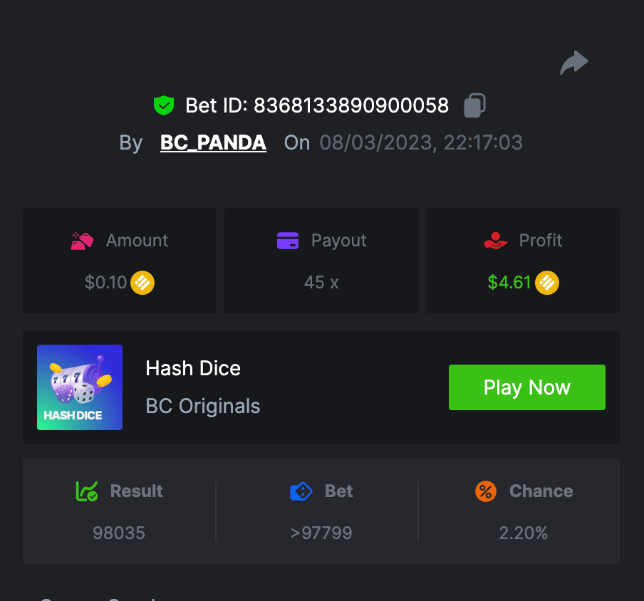 $1.5k Prestige Hash Dice Challenge #76 DURATION: 9th MAR - 13th MAR 12:30 pm UTC Welcome players, it's time to take chances! The challenge is the Hash Dice and participants will need to reach 16 exact target payouts, and all of them together will be summed up as 1 point (maximum 16 points). The Prize pool is $1,500 of which $250 will be reserved for the extra bonus. Get ready! Life is a gamble and you never know what comes next, so roll the dice! What's the Challenge? Complete as many of the following 16 payouts on Hash Dice. Must be a exact multiplier. | 20 | 33 | 45 | 55 | 66 | 75 | 88 | 222 | 305 | 444 | 555 | 666 | 888 | 1205 | 2500 | 3000 | Each payout you hit above counts as 1 point (Maximum 1 point for each payout). If there is a tie, the player with the higher average bet amount (in USD) shall be the winner. How to Enter To enter, copy the link of the bet you'd like to submit. Once you've copied it, paste it as a reply to this thread like so: Link: https://bc.game/#/sd/11516JYC3GIH3N In the same post, upload a screenshot of your win by clicking the game ID WITH VIEW IN USD mode ENABLED (accessible at the bottom of dropdown menu for your wallet up top. This way, we can ensure that your bet indeed met the minimum requirement at the time of placing it: https://bc.game/#/sd/11516JYC3GIH3N Minimum VIP There's no minimum VIP level Eligibility to Win Prize Win at least 3 payouts to qualify. Minimum Bet Size $0.10 USD equivalent Eligible Coins All cryptocurrencies are eligible (excepting JB) Available Prizes Positions 1st 2nd 3rd 4th 5th 6th-10th 11th-20th Bounty Prizes $500 $250 $125 $75 $50 $125 $125 $250 EXTRA BOUNTY Post a winning bet with 777x multiplier or more and receive an equal share of the $250 prize pool! Original rules apply with all minimum requirements. GENERAL TERMS Please combine all of your hits together in a SINGLE post. Edit your existing post for additional hits, don't create a new post. Each eligible entry must have the Bet Slip URL, failure to include it will disqualify participation in the event. Bet Slip image is not mandatory. Bets must be posted within 24 hours of placing bet in order to keep things fair for everyone. Bets must be made during the specified time window stated above. This thread will lock automatically when the time period is over. One (1) entry per household. Anyone found attempting to win multiple prizes will be disqualified from this challenge as well as all future challenges. Failure to follow instructions will result in your submission being null and void. By entering this challenge, you acknowledge that BC.Game has the final decision on results and placement. Payouts will be distributed after the event is finished. Please note that it could take anywhere between 24 hours to 7 days after the completion of the event.