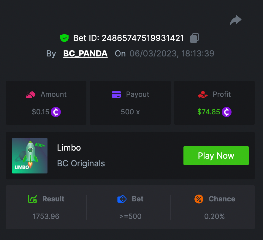 $1.5k Prestige Limbo Challenge #75 DURATION: 6th MAR - 9th MAR 12:30 pm UTC This weeks Prestige Challenge is back with your favourite game Limbo! Take part in this amazing yet challenging event to split prizes worth $1,500! Top 20 winners will get their share of the major prizes, and any participant who completes the extra bounty will receive an equal share of the $250 prize pool. Keep reading below to find out more details of this event. What's the Challenge? Win the highest multiplier you can on on BC.Game's in-house game, Limbo. If there is a tie, the player with the higher average bet amount (in USD) shall be the winner. If there is a tie in the amount and payout, the one who posted or edited his post first will be considered in the Ranking. How to Enter To enter, copy the link of the bet you'd like to submit. Once you've copied it, paste it as a reply to this thread like so: Link: https://bc.game/#/sd/114VMN10ZBRYMR In the same post, upload a screenshot of your win by clicking the game ID WITH VIEW IN USD mode ENABLED (accessible at the bottom of dropdown menu for your wallet up top. This way, we can ensure that your bet indeed met the minimum requirement at the time of placing it: Link: https://bc.game/#/sd/114VMN10ZBRYMR Minimum VIP There's no minimum VIP level Minimum Payouts Minimum payout to qualify is 20x Minimum Bet Size $0.15 USD equivalent Eligible Coins All cryptocurrencies are eligible (excepting JB) Available Prizes Positions 1st 2nd 3rd 4th 5th 6th-10th 11th-20th Bounty Prizes $500 $250 $125 $75 $50 $125 $125 $250 EXTRA BOUNTY Share a winning bet with 500x multiplier or above and receive an equal share of the $250 prize pool! Original rules apply with all minimum requirements. GENERAL TERMS Please combine all of your hits together in a SINGLE post. Edit your existing post for additional hits, don't create a new post. Each eligible entry must have the Bet Slip URL, failure to include it will disqualify participation in the event. Bet Slip image is not mandatory. Bets must be posted within 24 hours of placing bet in order to keep things fair for everyone. Bets must be made during the specified time window stated above. This thread will lock automatically when the time period is over. One (1) entry per household. Anyone found attempting to win multiple prizes will be disqualified from this challenge as well as all future challenges. Failure to follow instructions will result in your submission being null and void. By entering this challenge, you acknowledge that BC.Game has the final decision on results and placement. Payouts will be distributed after the event is finished. Please note that it could take anywhere between 24 hours to 7 days after the completion of the event.