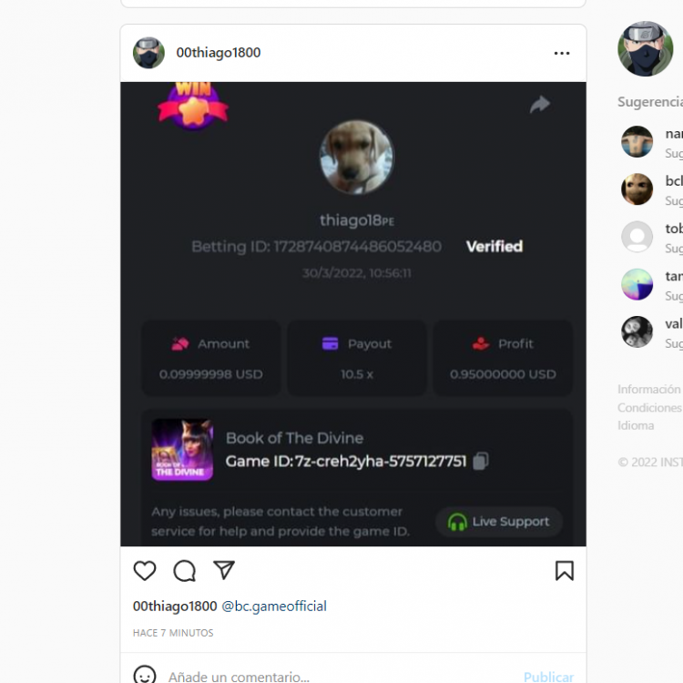 Low risk 1. nombre de usuario........ 00thiago1800 2. user.... 00thiago1800 https://www.instagram.com/p/CcgZXHjPNDL/?utm_source=ig_web_copy_link 3. User Thiago18 4. Username facebook... Thiago Soto yucra 5. 2Fa activado Medium risk 6. https://bc.game/sd/?sd=10IQMEGRD6T98Z High risk 7... https://bc.game/sd/?sd=10IQOHBTRBOF83
