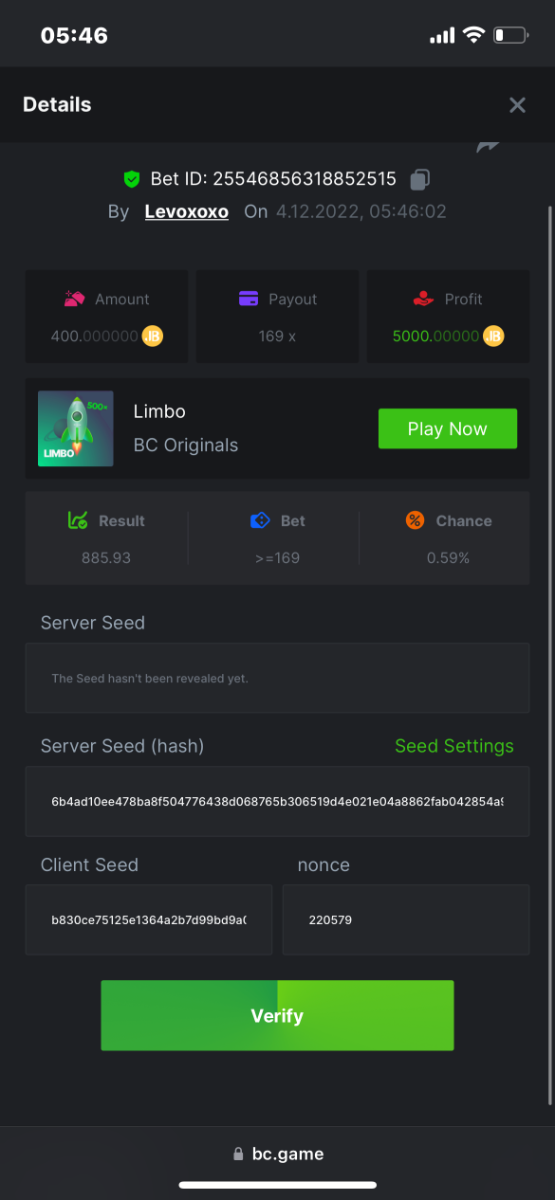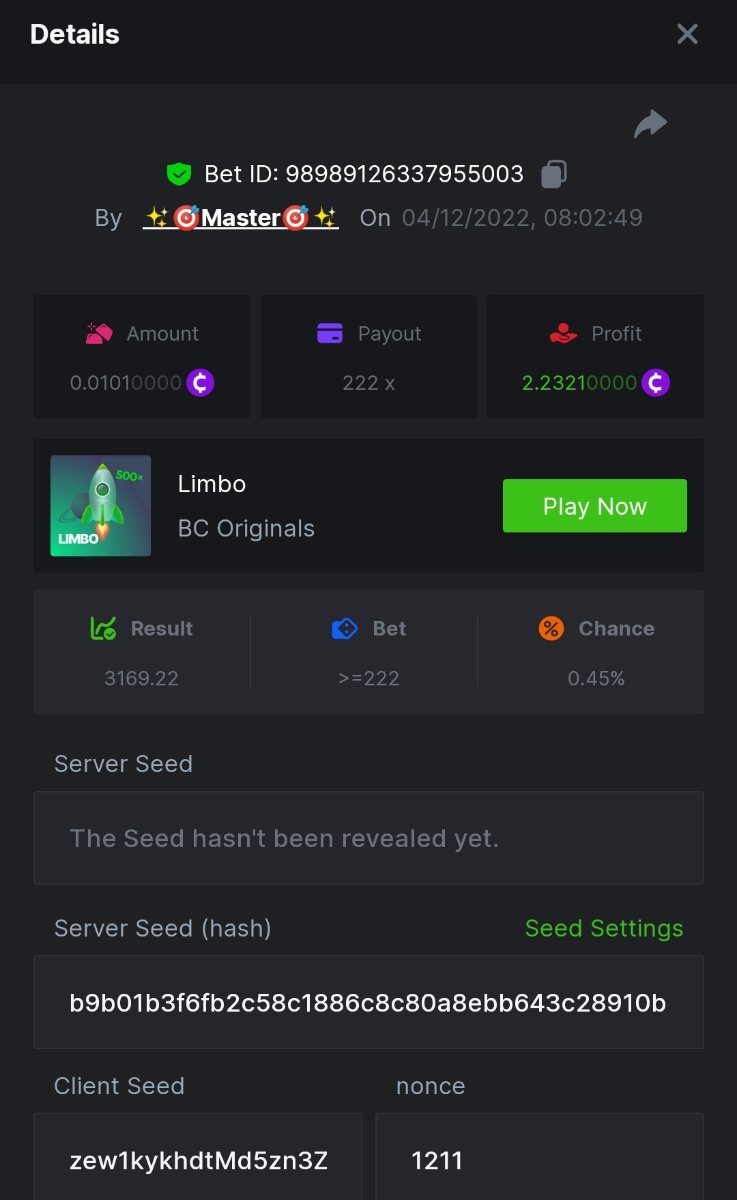 Wiro212sableng Posted December 4, 2022 Share Posted December 4, 2022 https://hash.game/#/sd/10YKLTYG7IKVMB uid : https://hash.game/game/limbo#/user/profile/2286288 Note: actually my bet set on dollar type 0.01 but didnt show 0.01 Link to comment Share on other sites More sharing options...