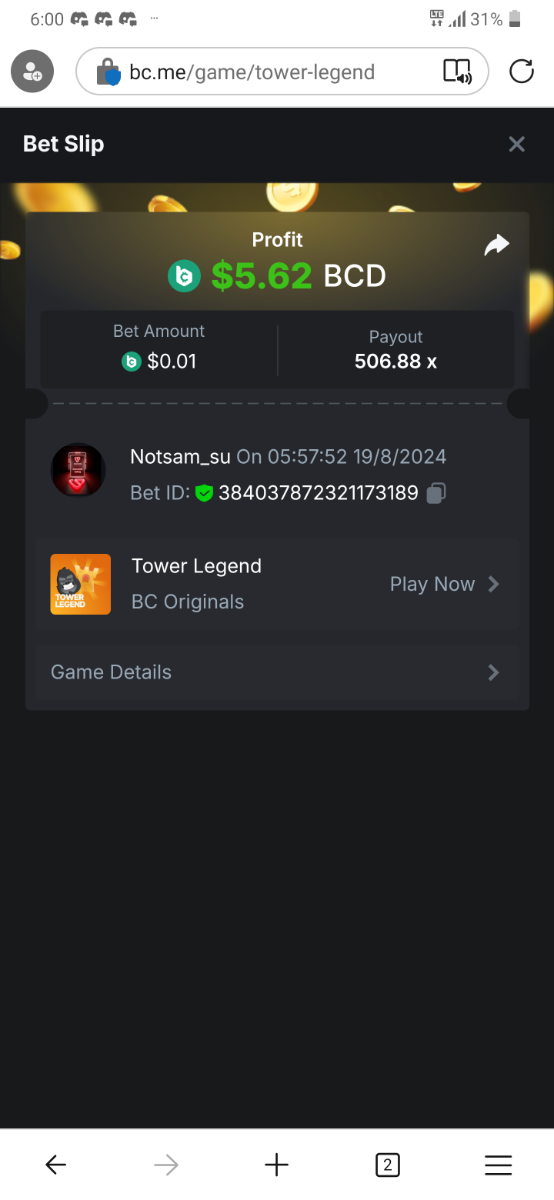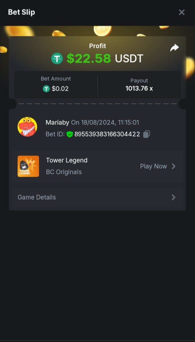 Moderator Giandreas Posted August 18, 2024 Moderator Share Posted August 18, 2024 Read Carefully Before Start To Hunt Forum Daily Challenges #687Hunt : Tower Legend Win the highest pay out Min Payout : x20 Min Level 10 ️Duration Starting : Now End time : 23.59 UTC Time How to Join? Make screenshot + paste your bet link + UID or Profile link Any coin, with min bet 0.01 USD is allowed (jb/bb/bcl not allowed) Reward Prizes 1st Place.....$7 BCD 2nd Place.....$5 BCD 3rd Place.....$4 BCD 4th Place.....$3 BCD 5th Place.....$2 BCD 🏵 Winners will be announcing next day after Roll Point! 1 Link to comment Share on other sites More sharing options...