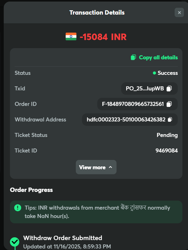This is my withdrawal request ( order ID F-1848970809665732561 placed on 16.11.2025, and on 17.11.2025, I got a notification stating that the withdrawal was processed, but I have not received money in my bank account. I have raised the ticket (9469084) and received a message stating that it is being processed as per the confirmation from the merchant. Now it's been I have been following up with customer service without any positive response from them. I have shared the bank statement as well to check.