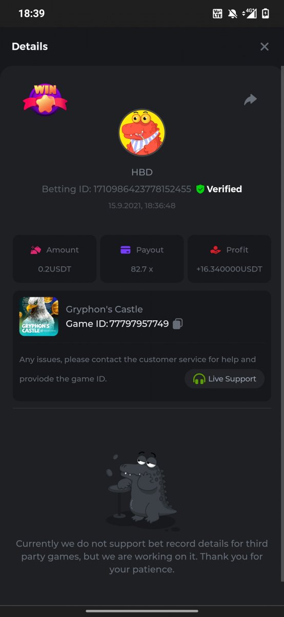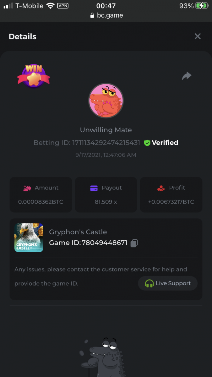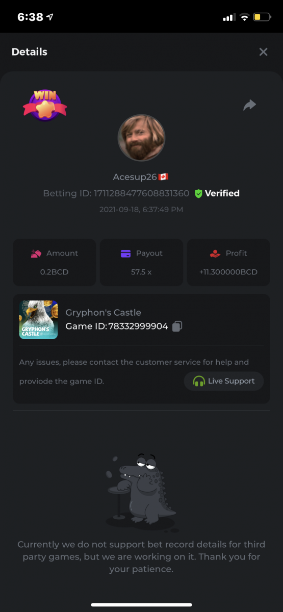 UnwillingNate Posted September 18, 2021 Share Posted September 18, 2021 On 9/14/2021 at 1:00 PM, Sleepiez said: Sleepiez Betting ID: 1710908475928993920 Gryphon's Castle (85.4x) Betting ID: 1710910332121292551 Book of Amaterasu (188x) Betting ID: 1710915648507424640 Riot (80x) Betting ID: 1711139402614348928 Wild Spirit (60.3x) Boy oh Boy alot of winning did not meet bet requirement lol Link to comment Share on other sites More sharing options...