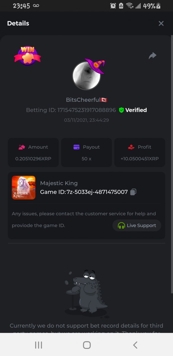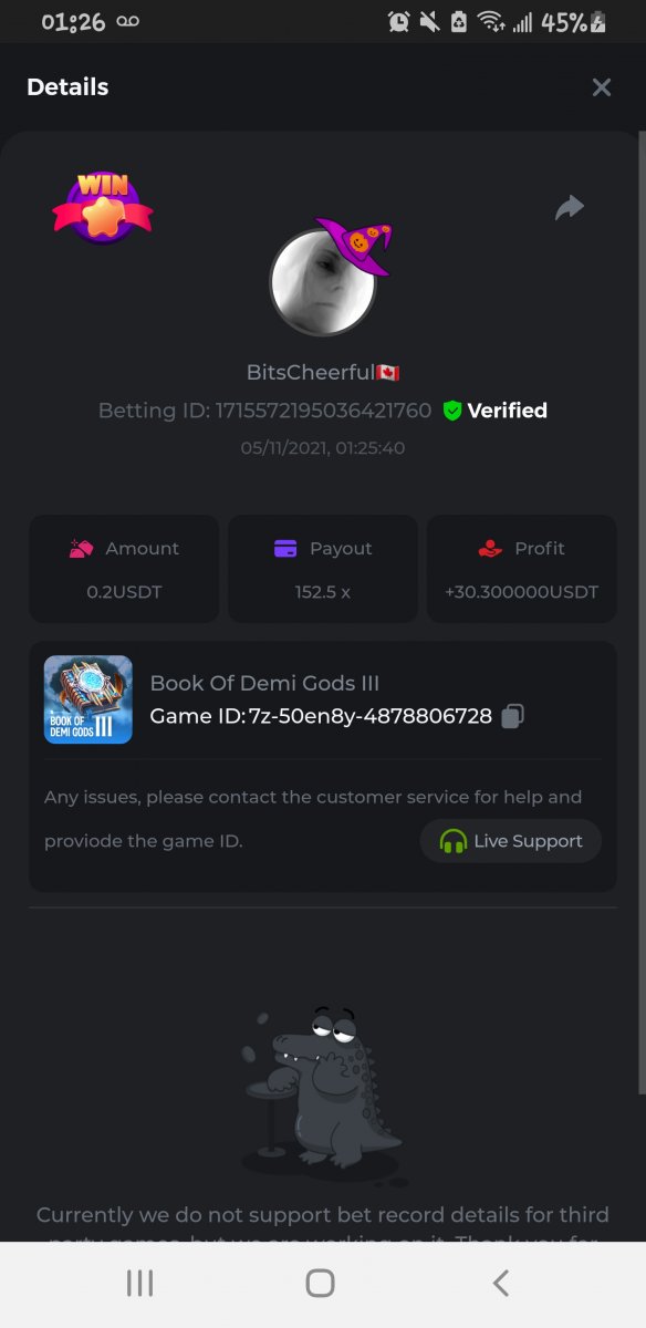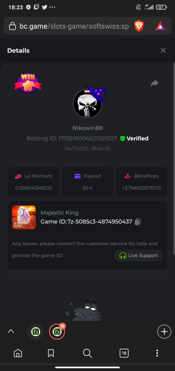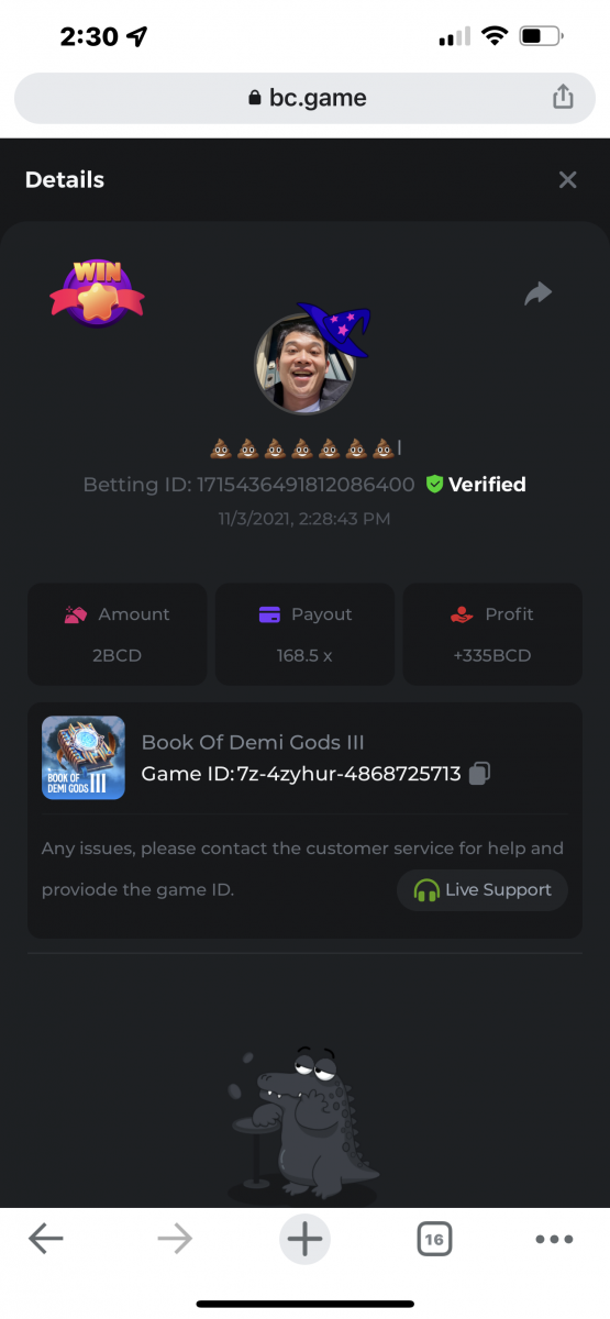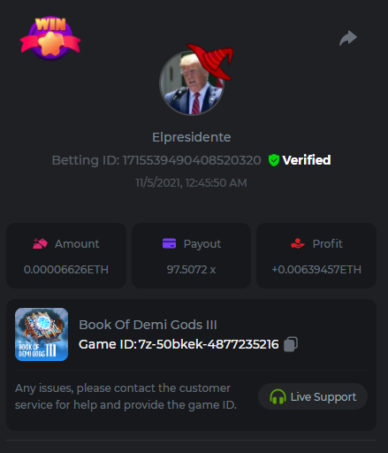 CryptoNoypii Posted November 3, 2021 Share Posted November 3, 2021 Majestic King (168.32x) Betting ID: 1715438513807407367 Joker Win (217.5x) Betting ID: 1715441480158532480 Demi Gods III (137x) Betting ID: 1715525222180370048 Book Of Demi Gods III (265.5x) Betting ID: 1715581490577926407 Majestic King (50x) (lucky multiplier) Betting ID: 1715784822324148352 Link to comment Share on other sites More sharing options...