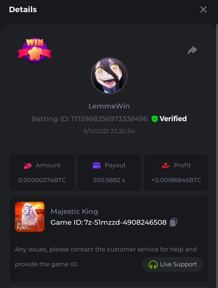 Mavrick951 Posted November 8, 2021 Share Posted November 8, 2021 On 11/2/2021 at 1:37 PM, BCGame_Joe said: Starts: 2, November 20:00 GMTEnds: 9, November 20:00 GMT Welcome back, this week we have a Spinomenal slot event, with a huge $4,000 prize pool! The event is simple - get the highest possible multiplier you can on the slots listed below! The top 3 highest multipliers posted for each slot will win one of the ranked prizes! To sweeten the treats a little further, anyone that completes the side bounty will receive a share of $400(details further down). Eligible Games Get the highest multiplier on any (or all) of the 4 slots below Book of Demi Gods III Majestic King Joker Win Demi Gods III Each player can only win 1 prize per slot, if a player submits more than 1 entry for the same slot, only the highest multiplier will count. Can I win a prize for each of the slots? YES - you can win one prize on each of the 4 slots listed + the bounty prize. Minimum VIP Tier Must be VIP08 or higher in order to enter this challenge. Minimum Bet Size Book of Demi Gods III - $0.20 Majestic King- $0.25 Joker Win - $0.20 Demi Gods III - $0.30 Eligible Coins All coins are eligible (excluding JB) Available Prizes Book of Demi Gods III - 1st place $500 2nd place.$250 3rd place$150 Majestic King - 1st place$500 2nd place$250 3rd place$150 Joker Win - 1st place -$500 2nd place$250 3rd place$150 Demi Gods III - 1st place$500 2nd place$250 3rd place$150 50x BOUNTY - Post a bet that shows EXACTLY 50x payout on any of the 4 slots within the timeframe of this challenge and receive a share of a $400! If nobody gets exactly 50x the person/s closest to 50x will win this bounty! How to Enter To enter, copy the bet ID of the bet you'd like to submit Once you've copied it, post it as a reply to this thread like so: Betting ID: 1708854428417660423 In the same post, upload a screenshot of your win by clicking the game ID WITH VIEW IN USD mode ENABLED (accessible at the bottom of dropdown menu for your wallet up top. This way, we can ensure that your bet indeed met the minimum requirement at the time of placing it: Example post - Betting ID: 1715345879721985408 Good Luck Everyone! Heres one book for demi gods 3 EDIT: make that 2 Betting ID: 1715884076127259143 Betting ID: 1715884822680596352 Link to comment Share on other sites More sharing options...