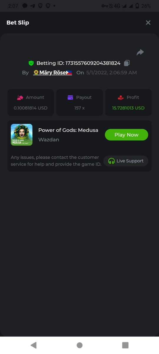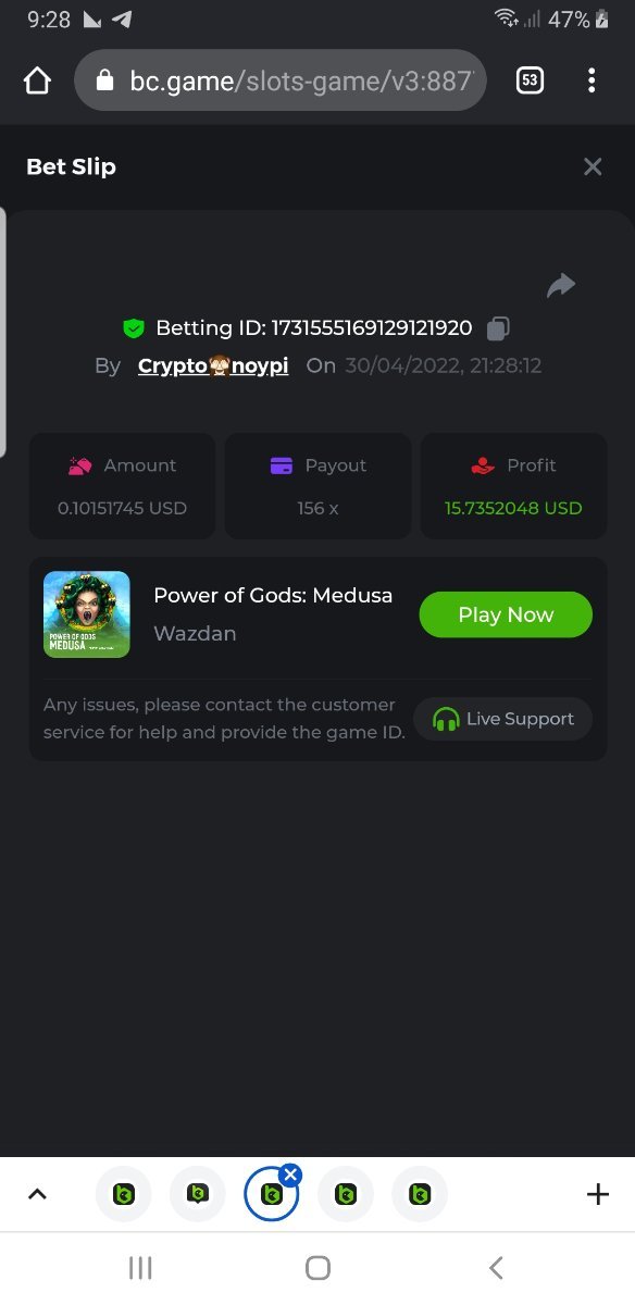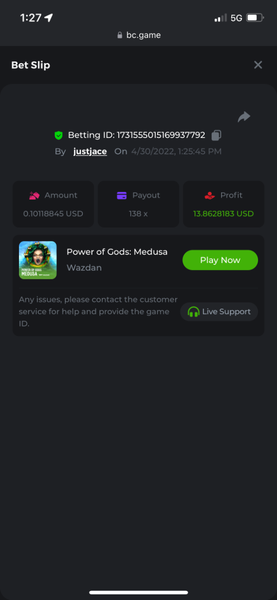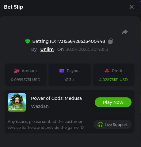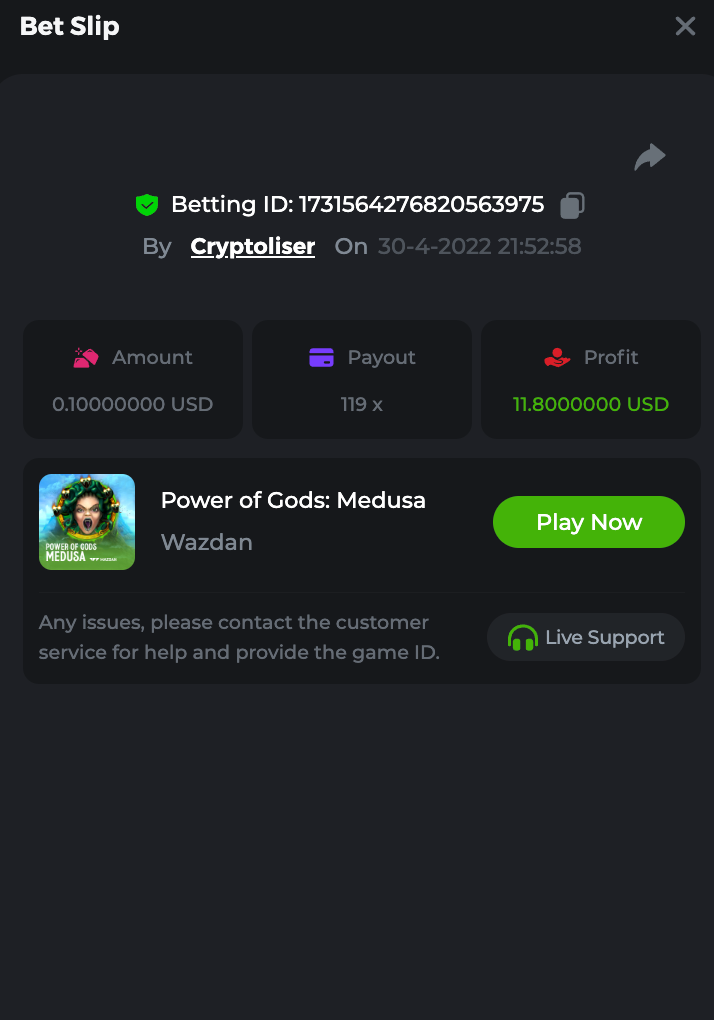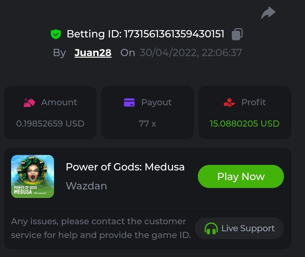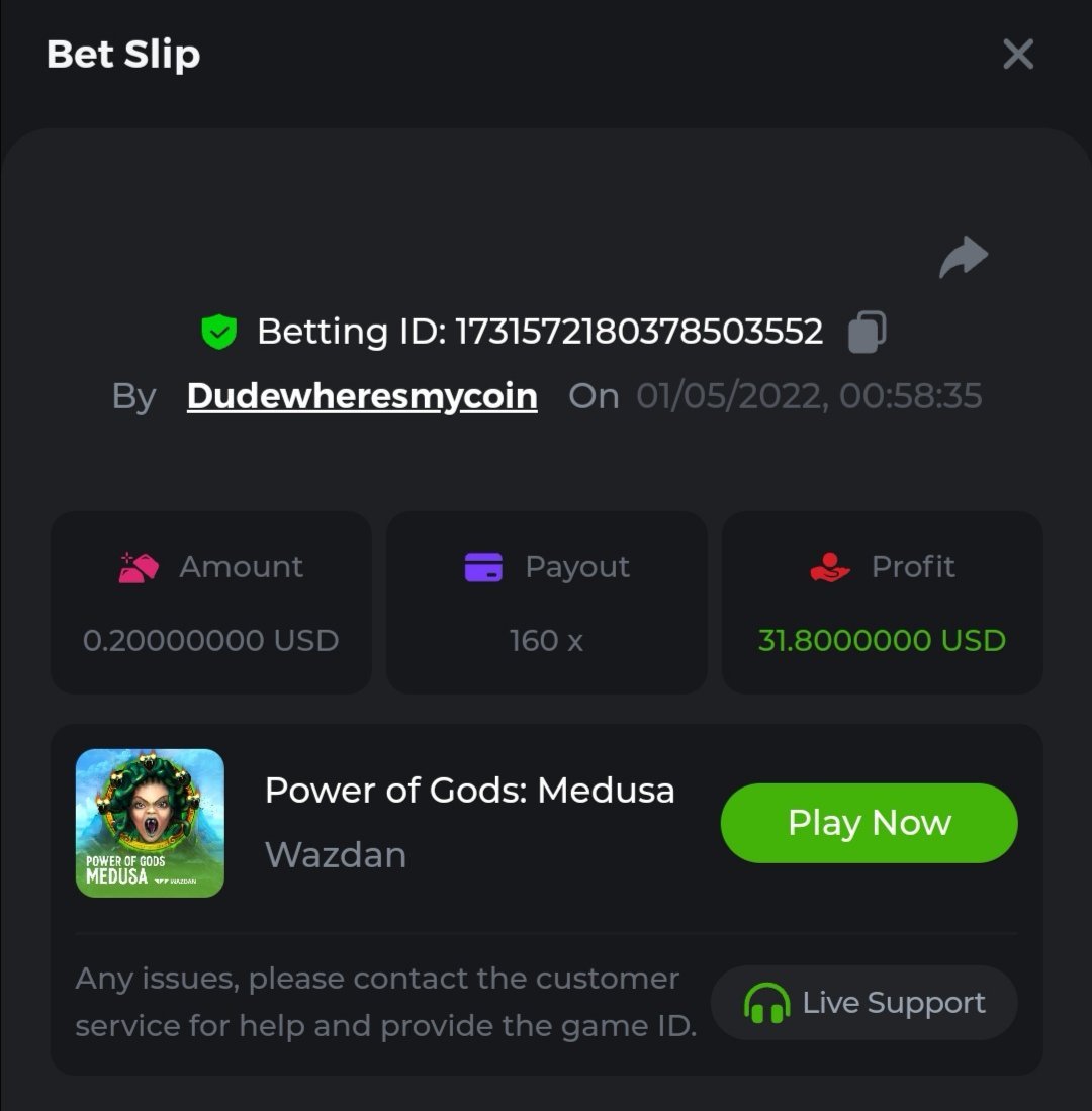 bassabar Posted April 30, 2022 Share Posted April 30, 2022 Power of Gods: Medusa Multiplier: 16x https://bc.game/sd/?sd=10JJUH7PSCZ0NN Link to comment Share on other sites More sharing options...
