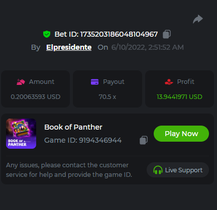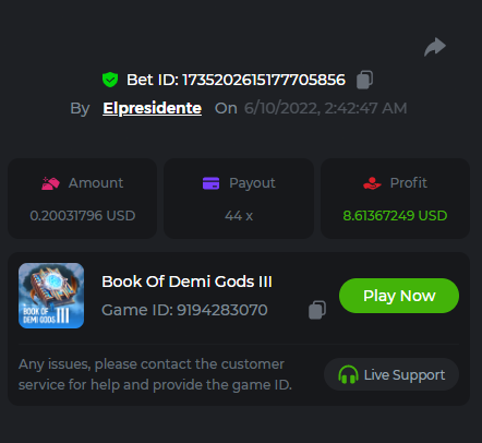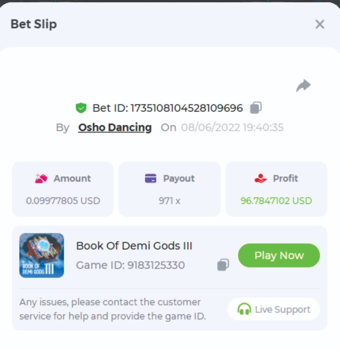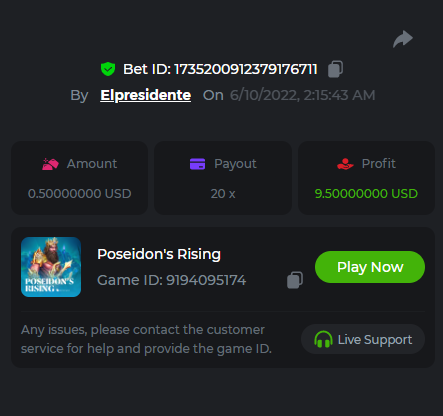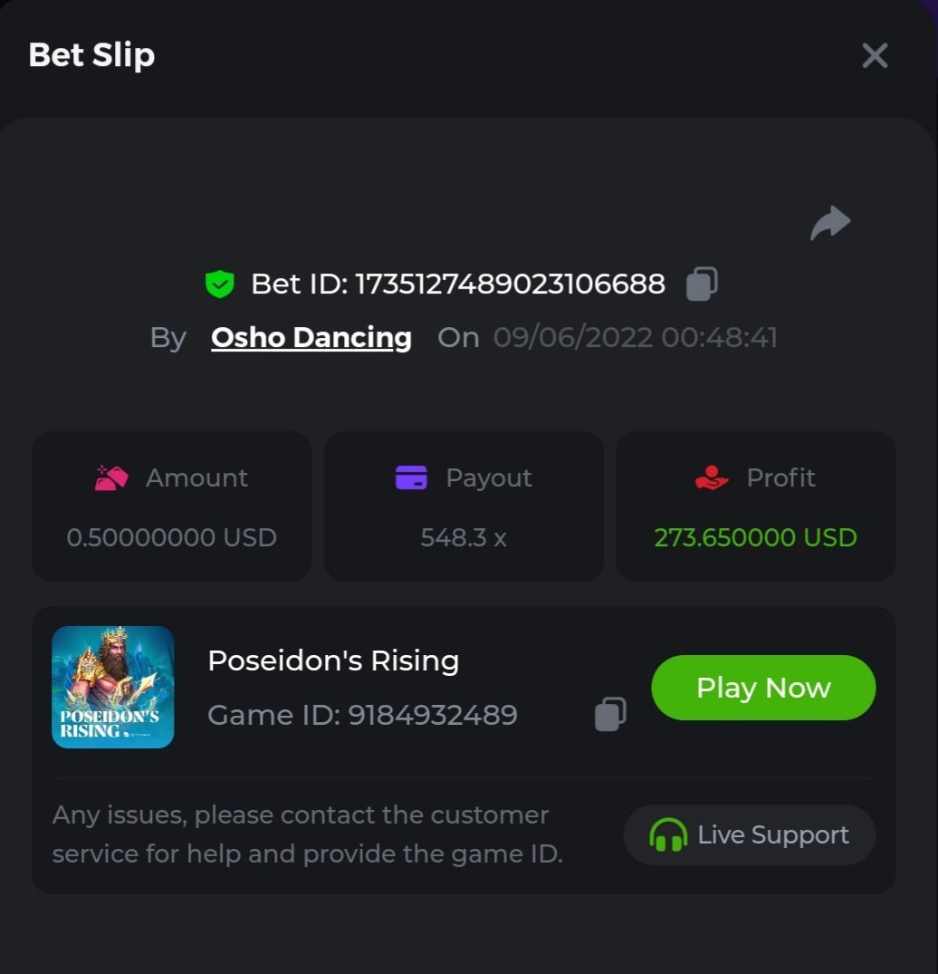 Event Team Niobium Posted June 8, 2022 Event Team Share Posted June 8, 2022 Hello Dear VIPs! Welcome back for this week's battle, we're hosting another Spinomenal event with a prize pool of up to $4,000! Participants need to hit the highest multipliers on six selected slots and payouts will be added together to rank. In addition, those who complete the bonus will receive 10% of the prize equally. Don't forget that luck is what happens when preparation meets opportunity. (details further down). Eligible Games Win the highest multiplier on the Spinomenal slots listed below Poseidon's Rising Book Of Demi Gods III Kupala Book Of Panther Golden Piggy Bank - Bling Bling Savannah's Queen The highest multiplier reached in each game will be added together and counted as total points. Bonus buys are allowed. If the player submits multiple winning entries for the same game, the entry with the highest multiplier will be valid. Minimum VIP Tier Must be VIP04 or higher in order to enter this event. Minimum Payout Minimum payout to qualify is 10x (in any game) for a valid entry. Minimum Bet Size Poseidon's Rising - $0.50 Book Of Demi Gods III - $0.10 Kupala - $0.10 Book Of Panther - $0.10 Golden Piggy Bank - Bling Bling - $0.20 Savannah's Queen - $0.25 Eligible Coins All cryptocurrencies are eligible (excepting JB, and BCL). Free Play Mode is not valid for this event. Prize Pool & Reward Breakdown The winners will win a share of the prize pool based on the detailed ranking below. Anyone who completes the side bounty will receive a share of a 10% of the prize pool. BOUNTY - Share a bet that shows exactly 51x payout on any of the six games within the timeframe of this Battle and receive a share of 10% of the prize pool! If nobody wins exactly payouts the player/s closest to the payout will win this bounty! Original rules apply with min bet, minimum payout & VIP. How to Enter Access the game to select your Bet ID, click on the Share icon (↷) and then Copy link. Return to the topic, paste the link in the field "Reply to this topic..." E.g.: https://bc.game/sd/?sd=10M8GKHQNHVUOJ Each eligible entry must have the Bet Slip URL, the non-inclusion of the link will disqualify participation in the event. In the same post, upload a screenshot of your win by clicking the game ID WITH VIEW IN USD mode ENABLED (accessible at the bottom of dropdown menu for your wallet up top, and Submit Reply. Done! This way, we can ensure that your bet indeed met the minimum requirement at the time of placing it: Example post - Link: https://bc.game/sd/?sd=10M8GKHQNHVUOJ Good luck everyone! Link to comment Share on other sites More sharing options...